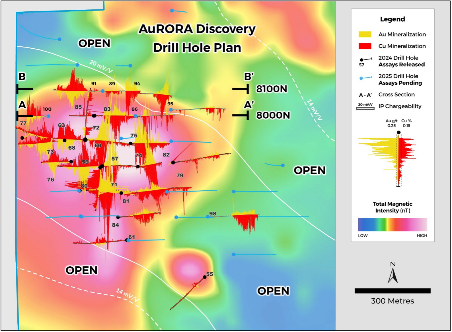 Twenty-four drill holes (9,687 m) were completed at the AuRORA Deposit in 2025: 23 of these are expansion step-out holes drilled over an area of 1 km by 1 km (see Amarc release October 22, 2025). Assay results from six drill holes completed on Sections 8000N and 8100N announced today have successfully expanded AuRORA +200 m to the north (see Figures 1 to 3, and Tables 1 and 2). The deposit remains open to further expansion to the north, east and west of Section 8000N and 8100N, with assay data pending from additional 2025 drill holes located further to the north. This northern extension to the deposit is in addition to partial assay results from AuRORA hole JP25098 announced in September that expand the deposit approximately 300 m to the southeast. Host rocks, alteration and mineralization remain consistent with that encountered in the 2024 AuRORA discovery drill holes.