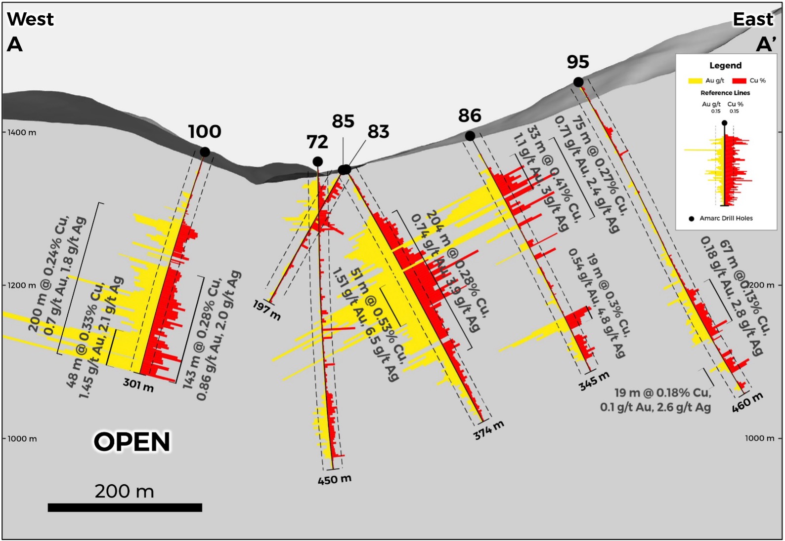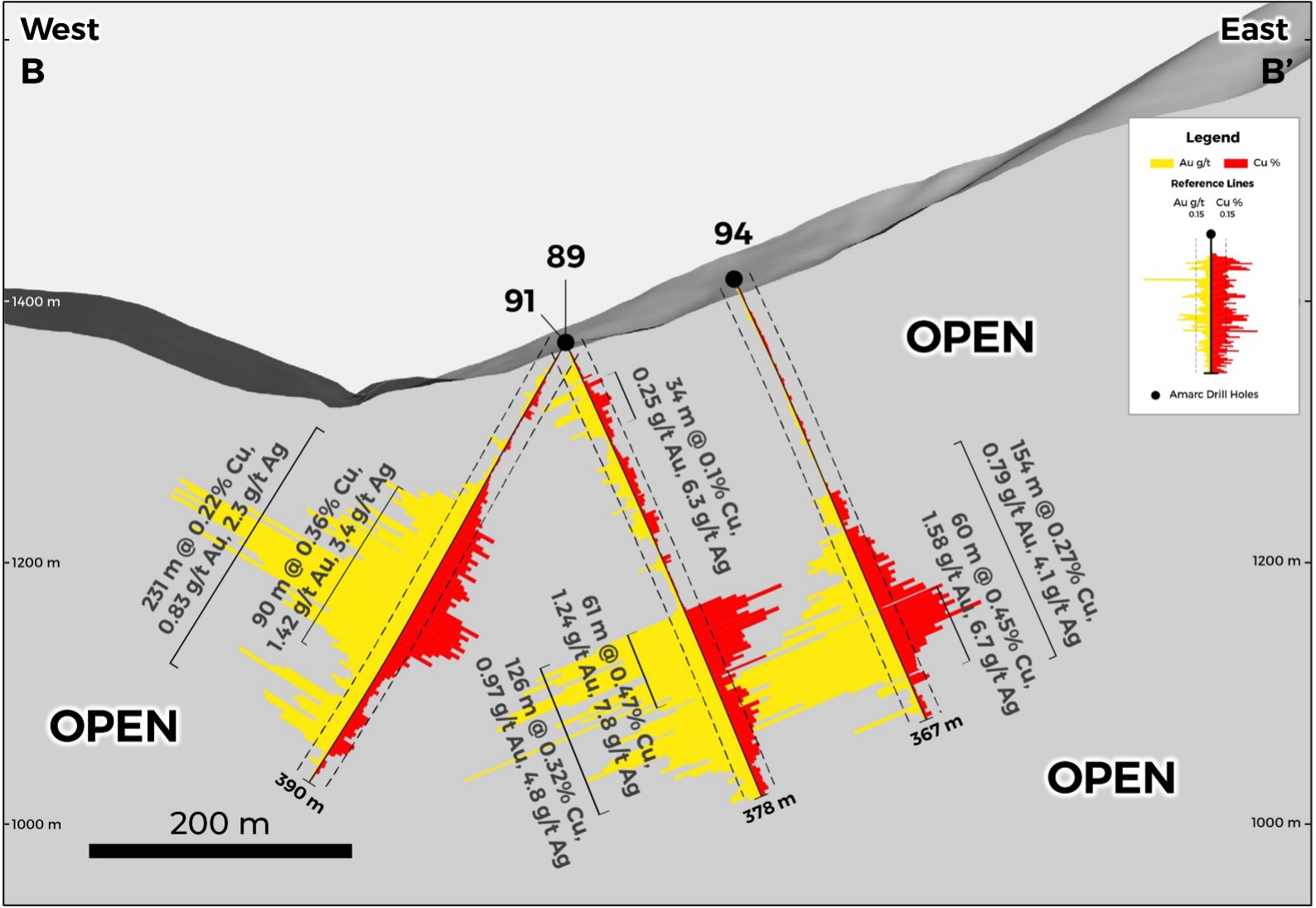 141 m of 1.11 g/t Au, 0.31% Cu and 3.0 g/t Ag - 154 m of 0.79 g/t Au, 0.27% Cu and 4.1 g/t Ag including